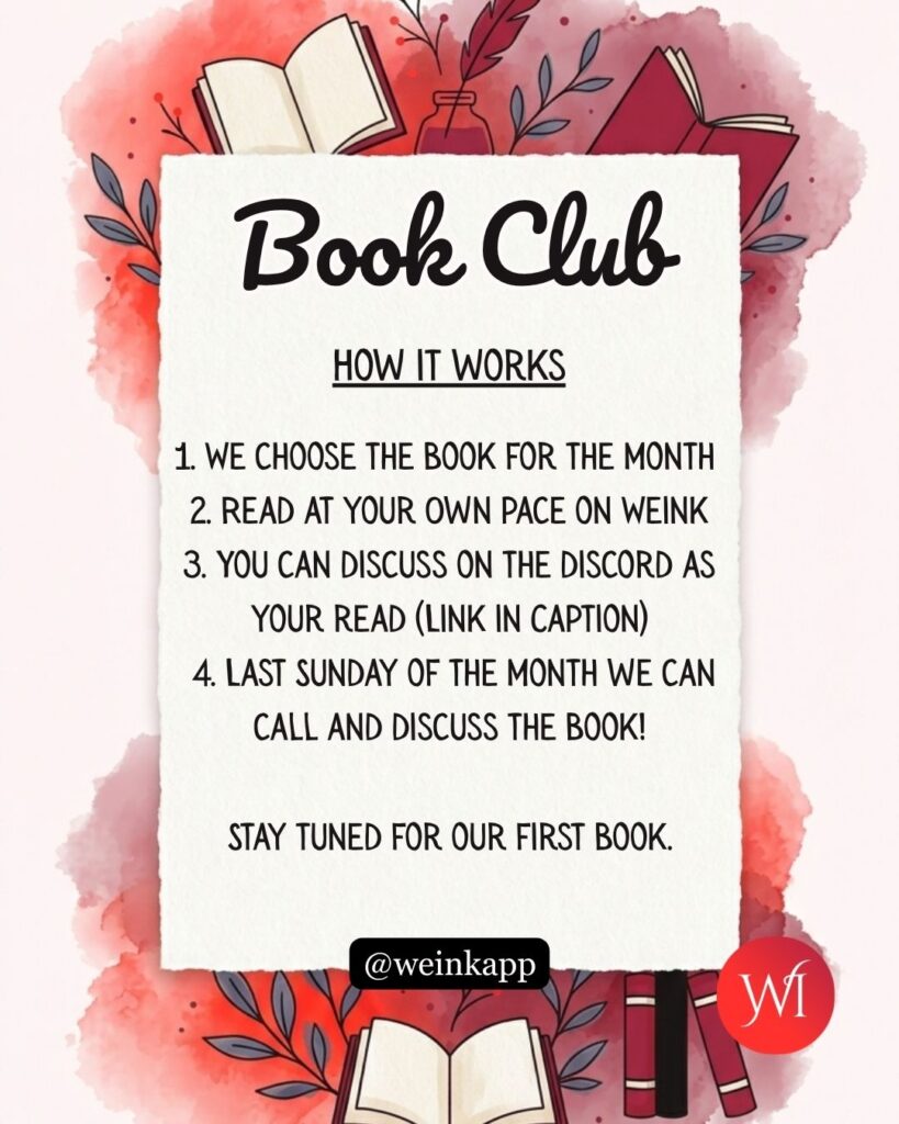The Weink book club is about building a book club community! If you’re part of the Weink community, we’d love to hear from you! If you’re interested in being featured in a future indie author book club selection, or if you want to get more involved! We’re always looking to discover new authors and support indie authors. Never hesitate to reach out via DMs or Discord — we’re always open to suggestions đź’«